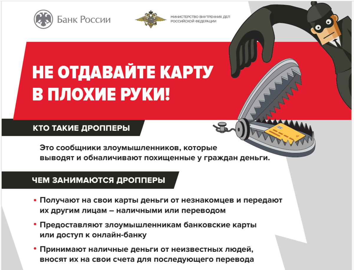 Именно дропперы являются одним из ключевых звеньев в схемах кибермошенников. Их счета и карты используются для дробления, переводов и снятия похищенных средств граждан.